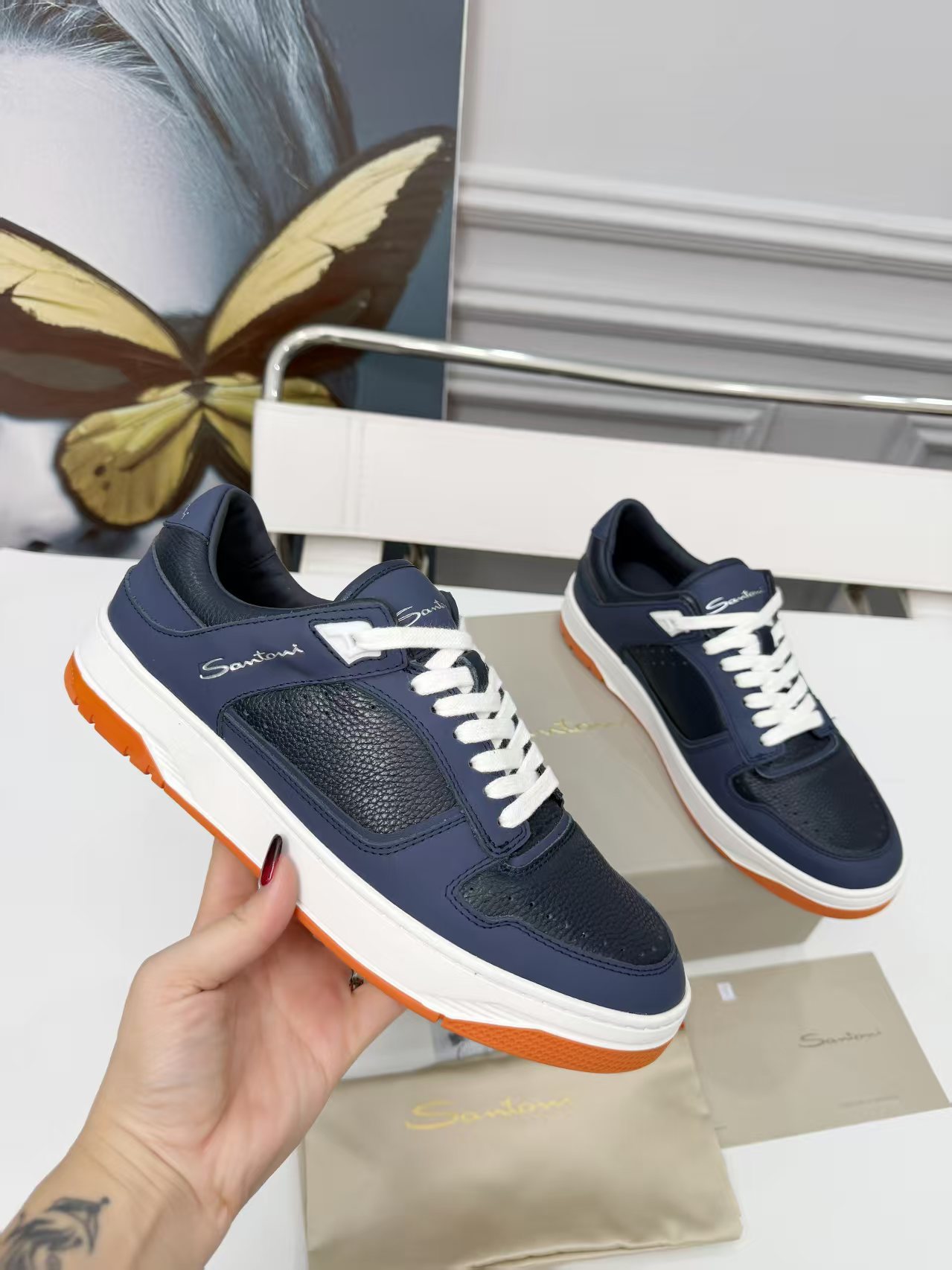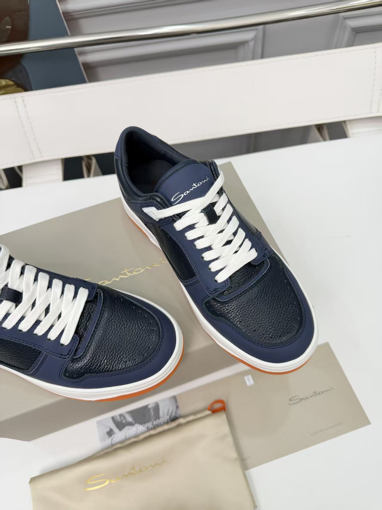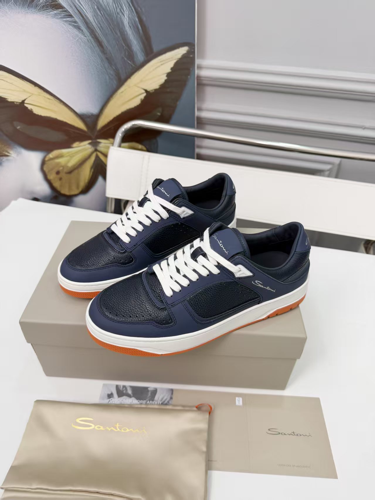 這款鞋子是AAAAA 1:1 質量(非常棒). 使用了和原版一模一樣的材料. 商標部分也保持了和Santoni一樣. 圖片拍攝是實物鞋子拍攝, 您所收到的實物保證和我們圖片一模一樣.