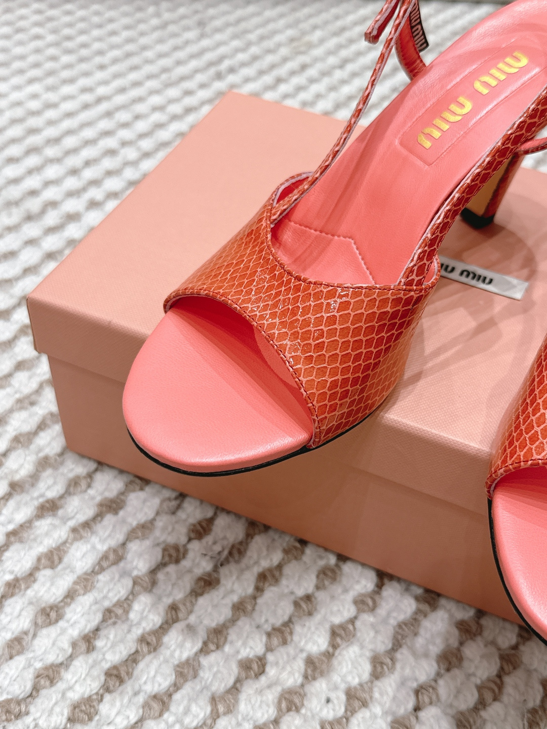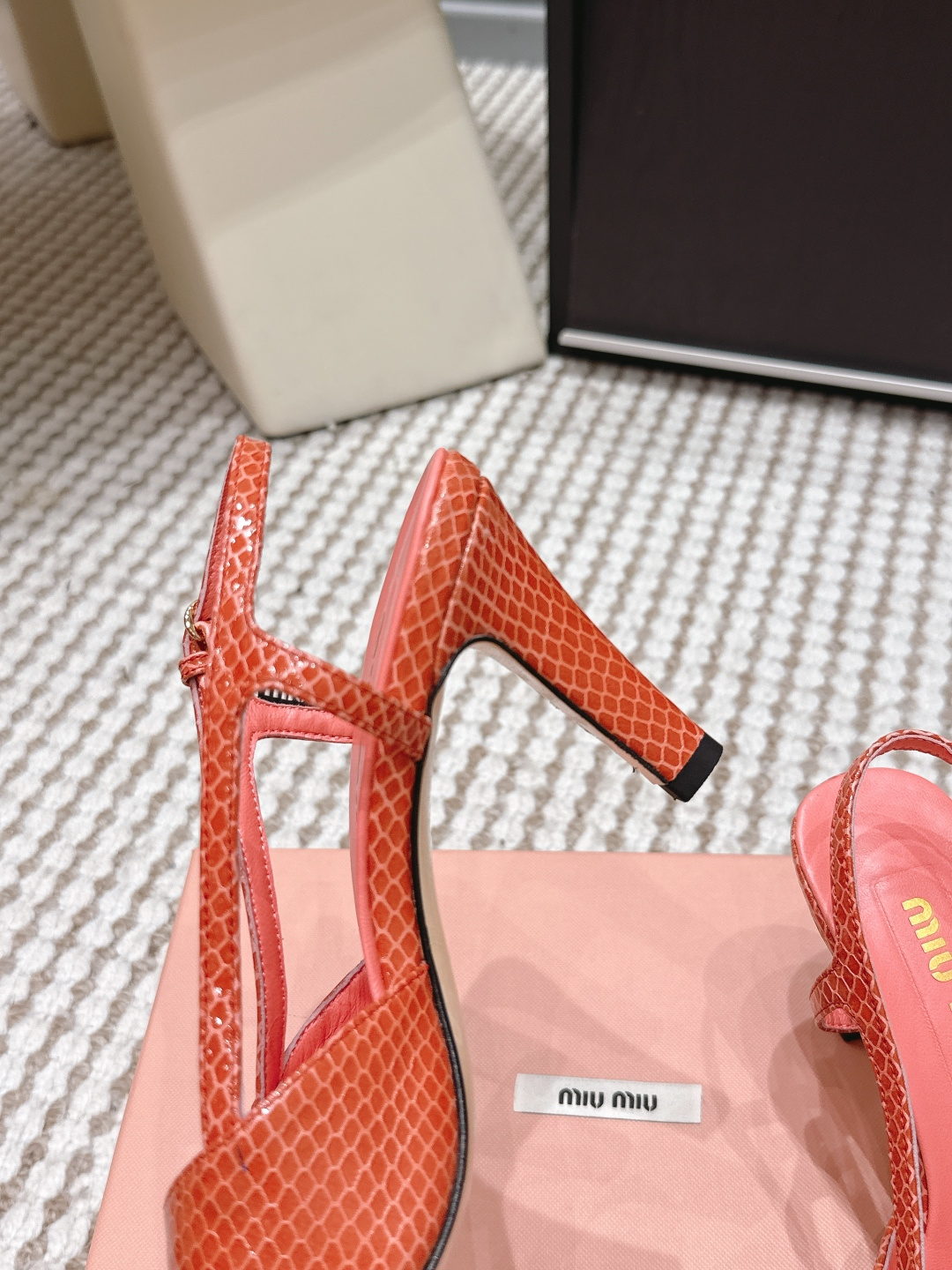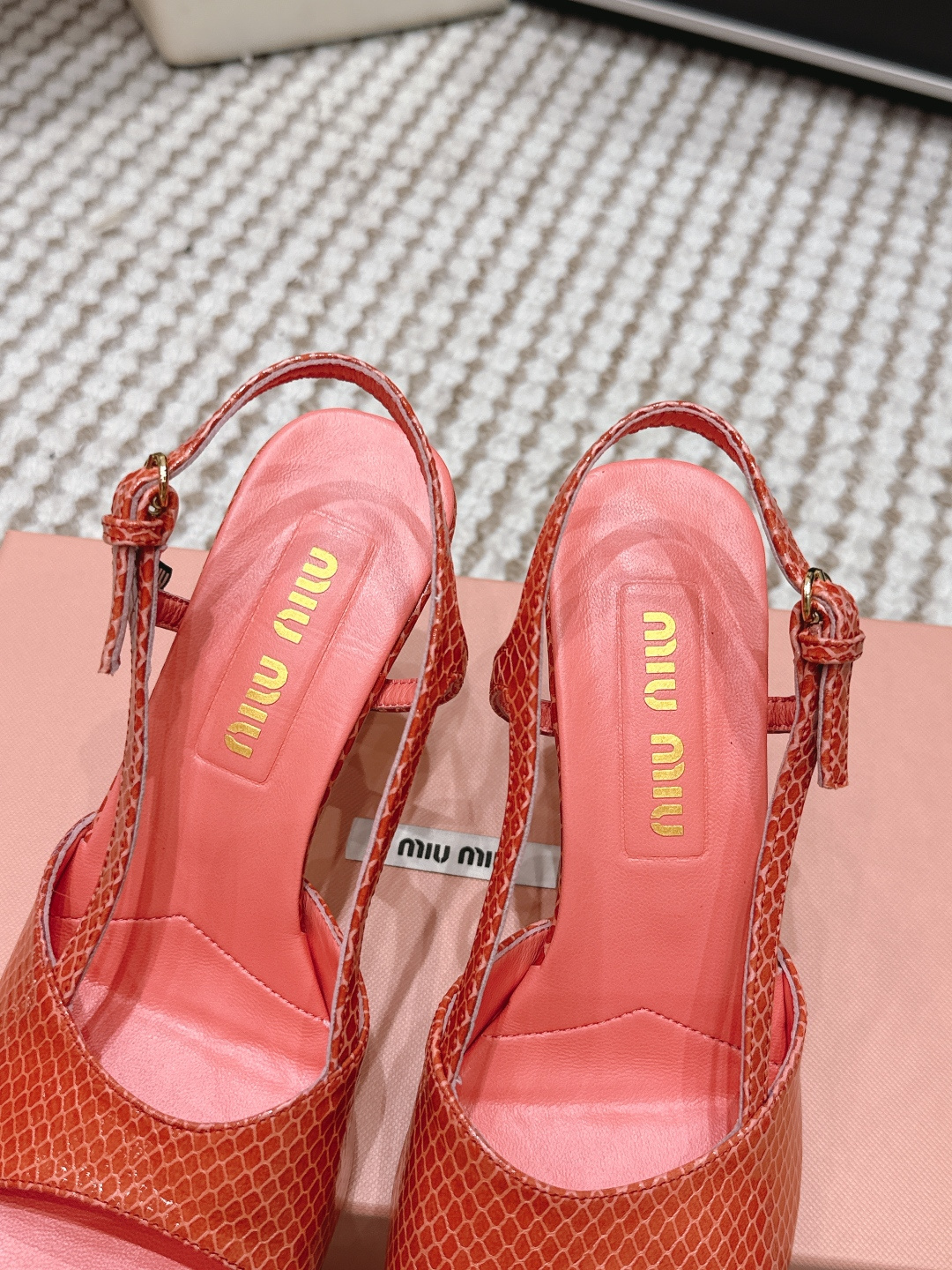 這款鞋子是AAAAA 1:1 質量(非常棒). 使用了和原版一模一樣的材料. 商標部分也保持了和繆繆/Miu Miu一樣. 圖片拍攝是實物鞋子拍攝, 您所收到的實物保證和我們圖片一模一樣.