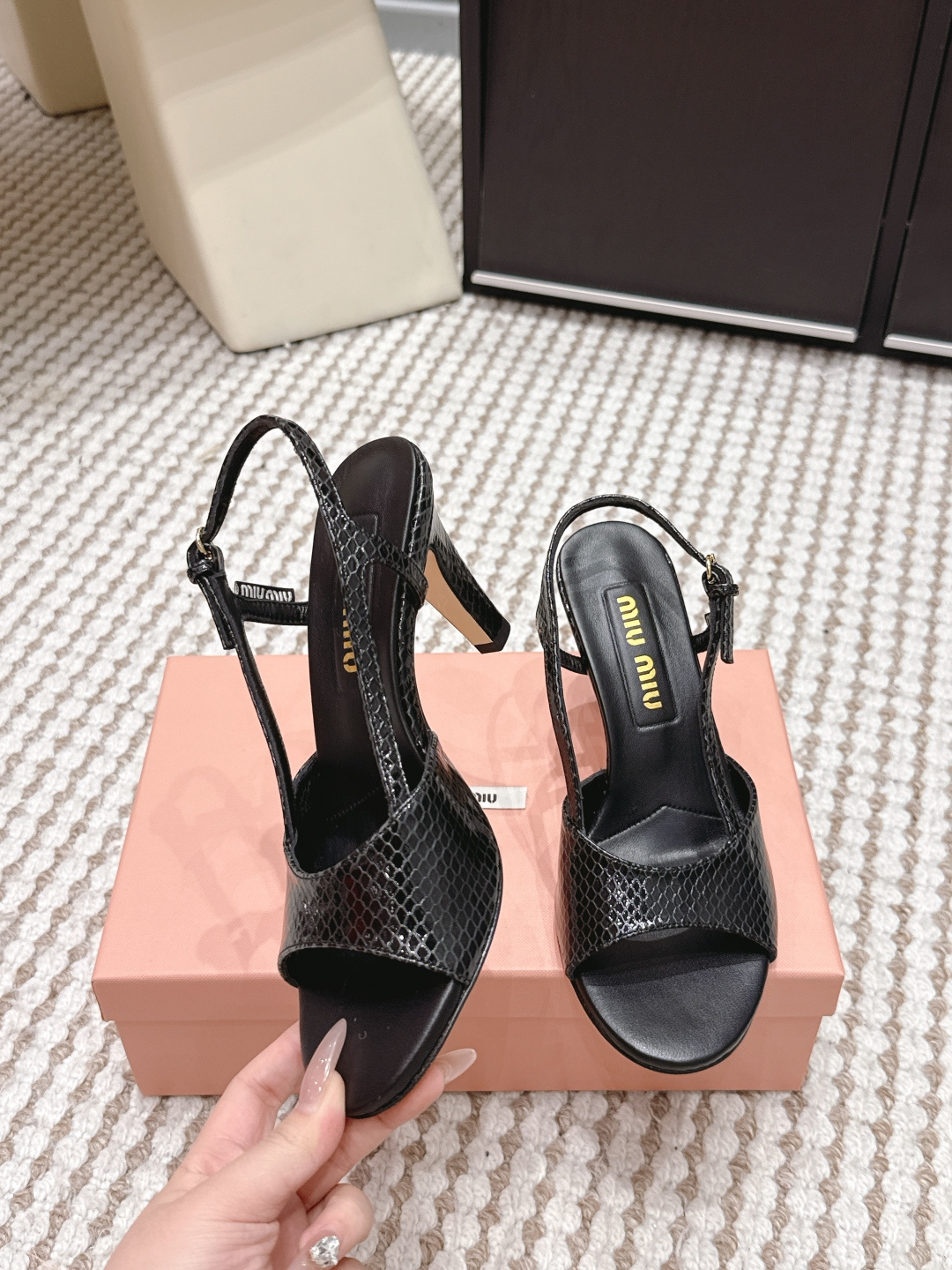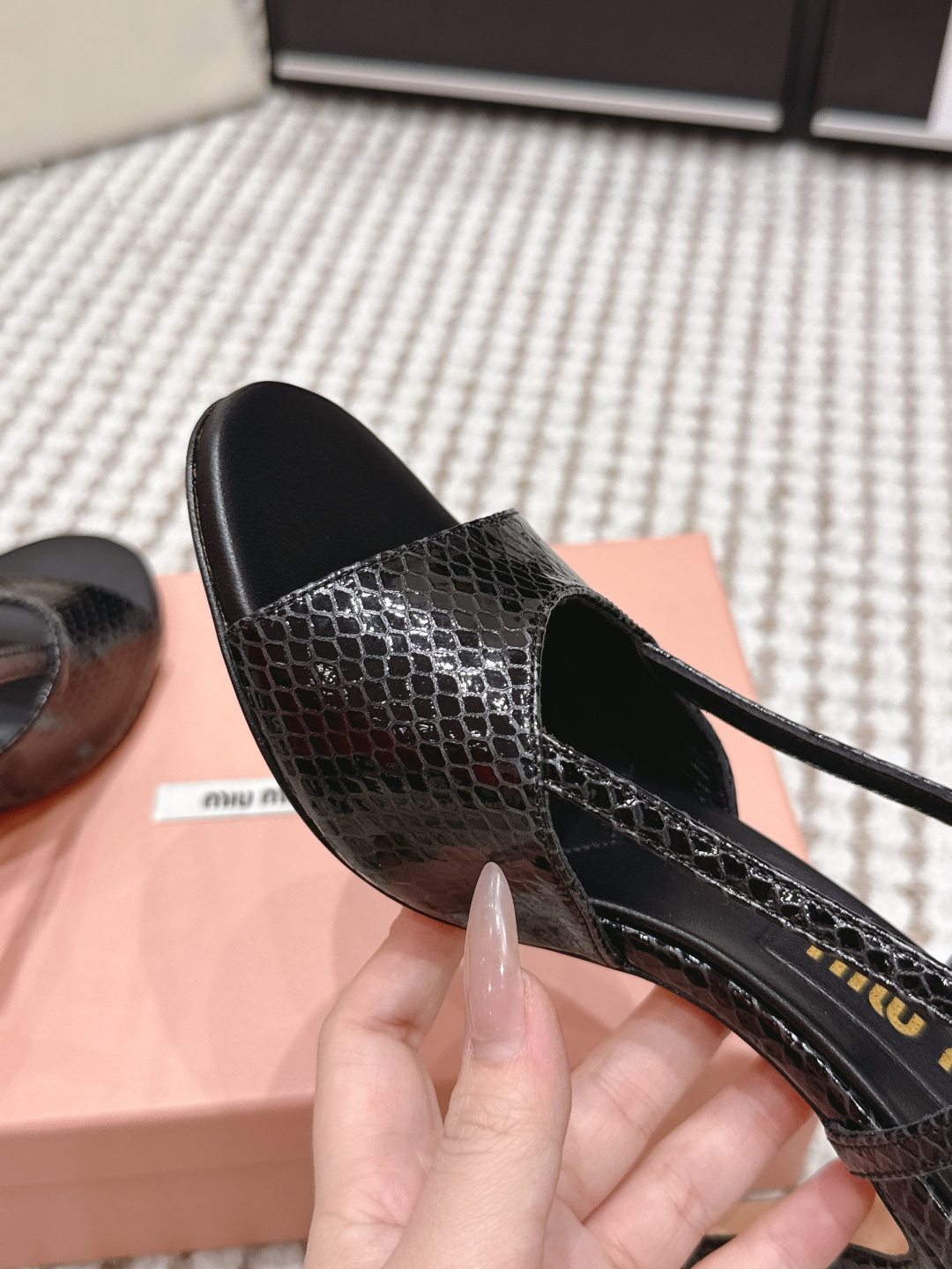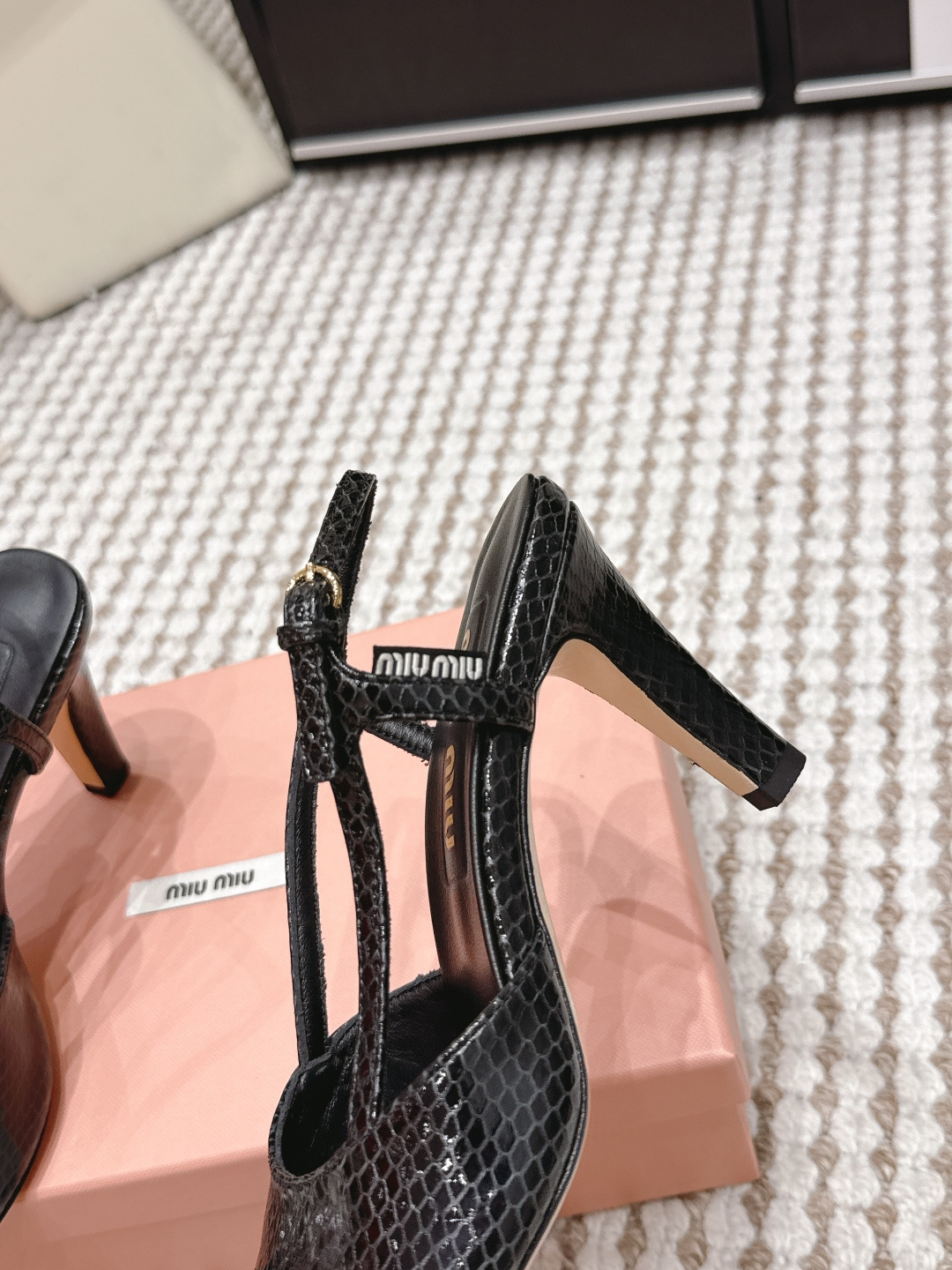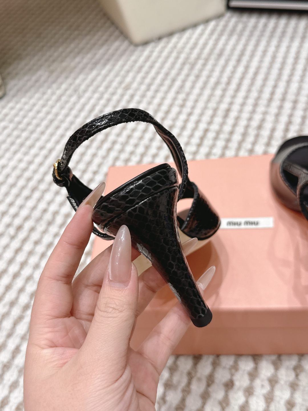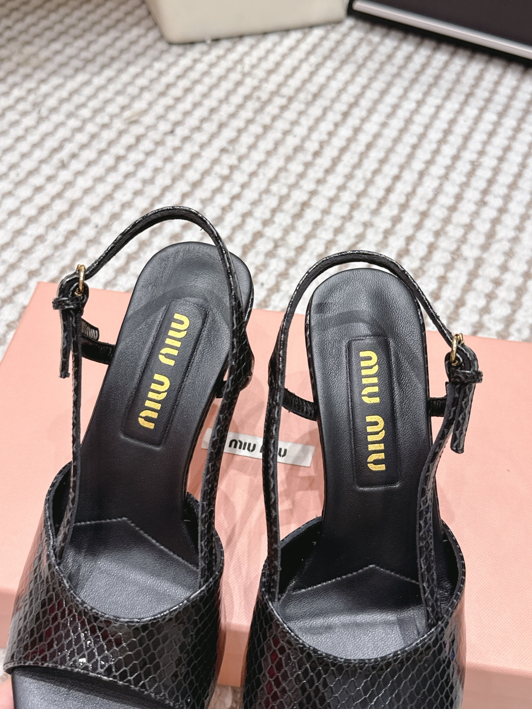 這款鞋子是AAAAA 1:1 質量(非常棒). 使用了和原版一模一樣的材料. 商標部分也保持了和繆繆/Miu Miu一樣. 圖片拍攝是實物鞋子拍攝, 您所收到的實物保證和我們圖片一模一樣.