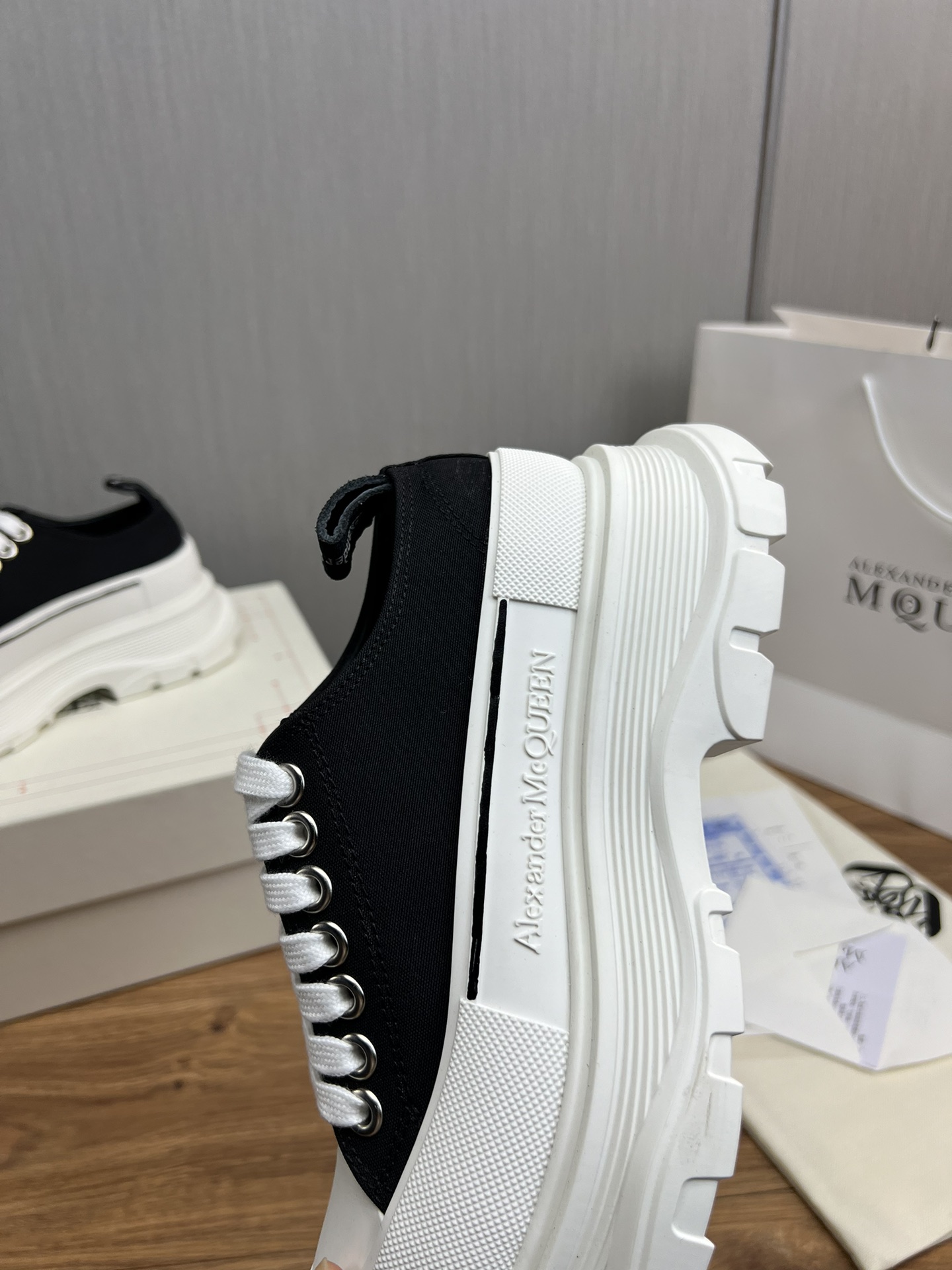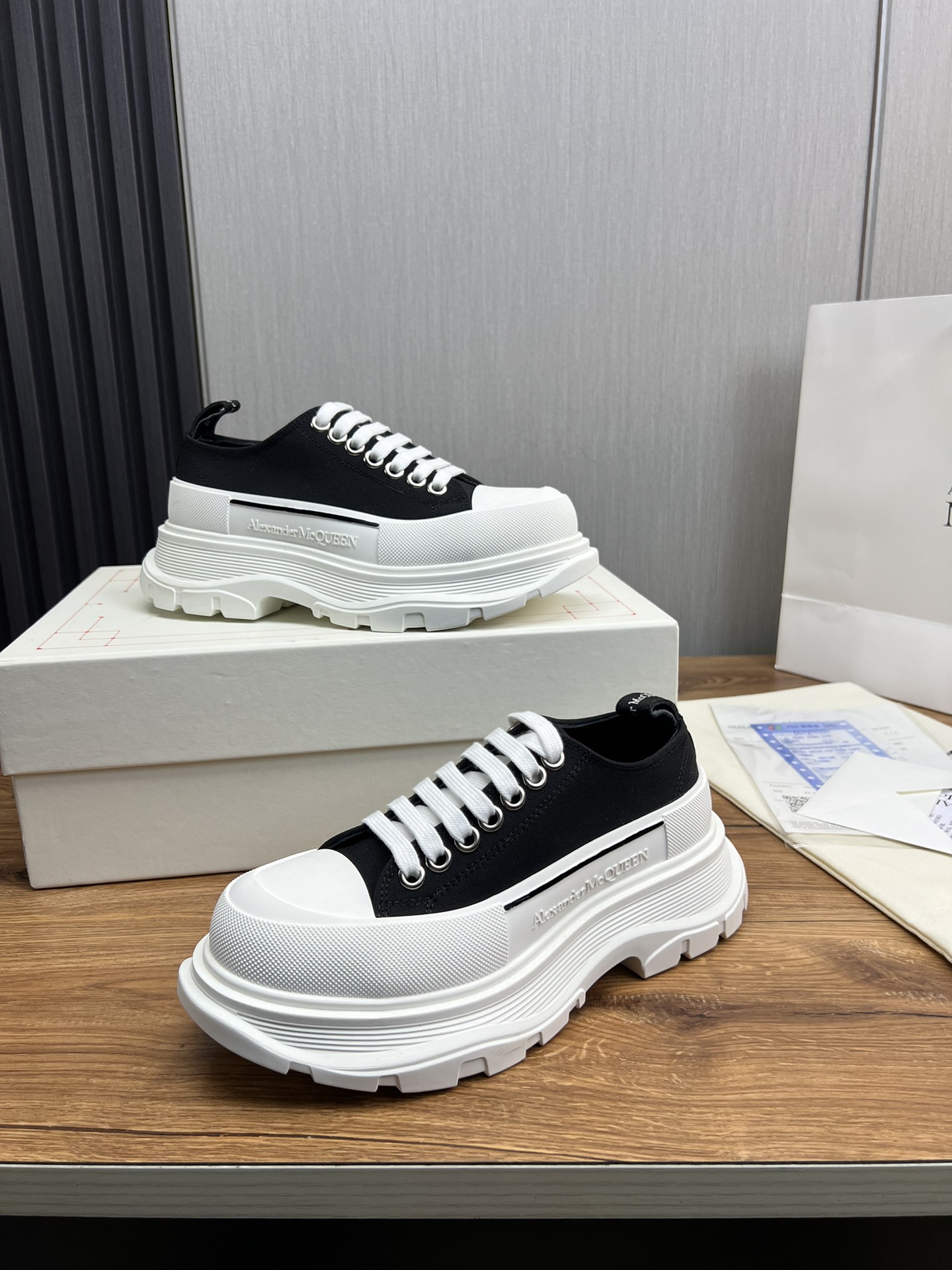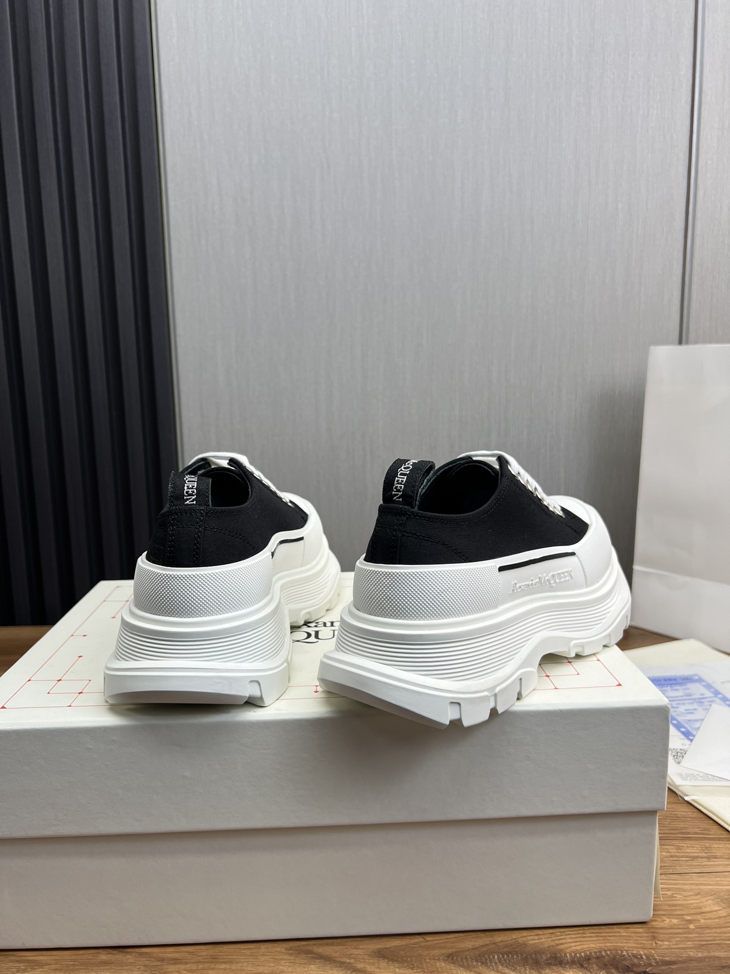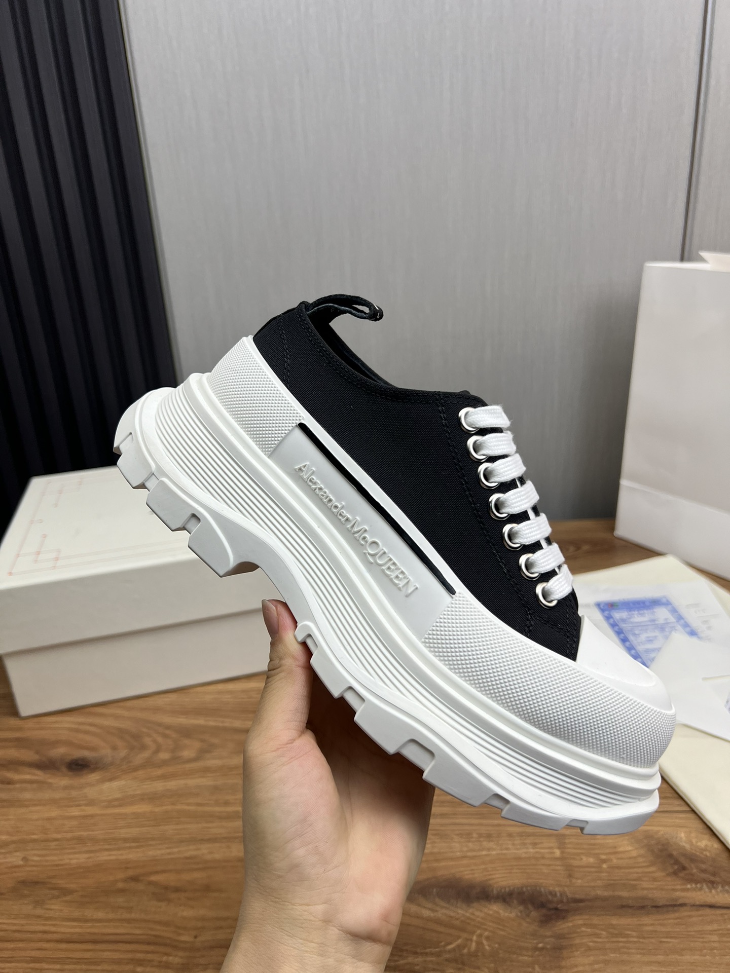 這款鞋子是AAAAA 1:1 質量(非常棒). 使用了和原版一模一樣的材料. 商標部分也保持了和麥奎恩/McQueen一樣. 圖片拍攝是實物鞋子拍攝, 您所收到的實物保證和我們圖片一模一樣.