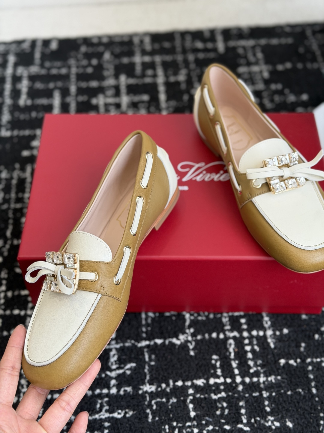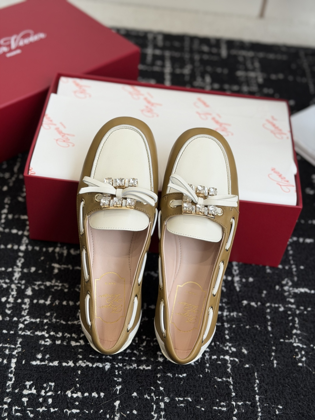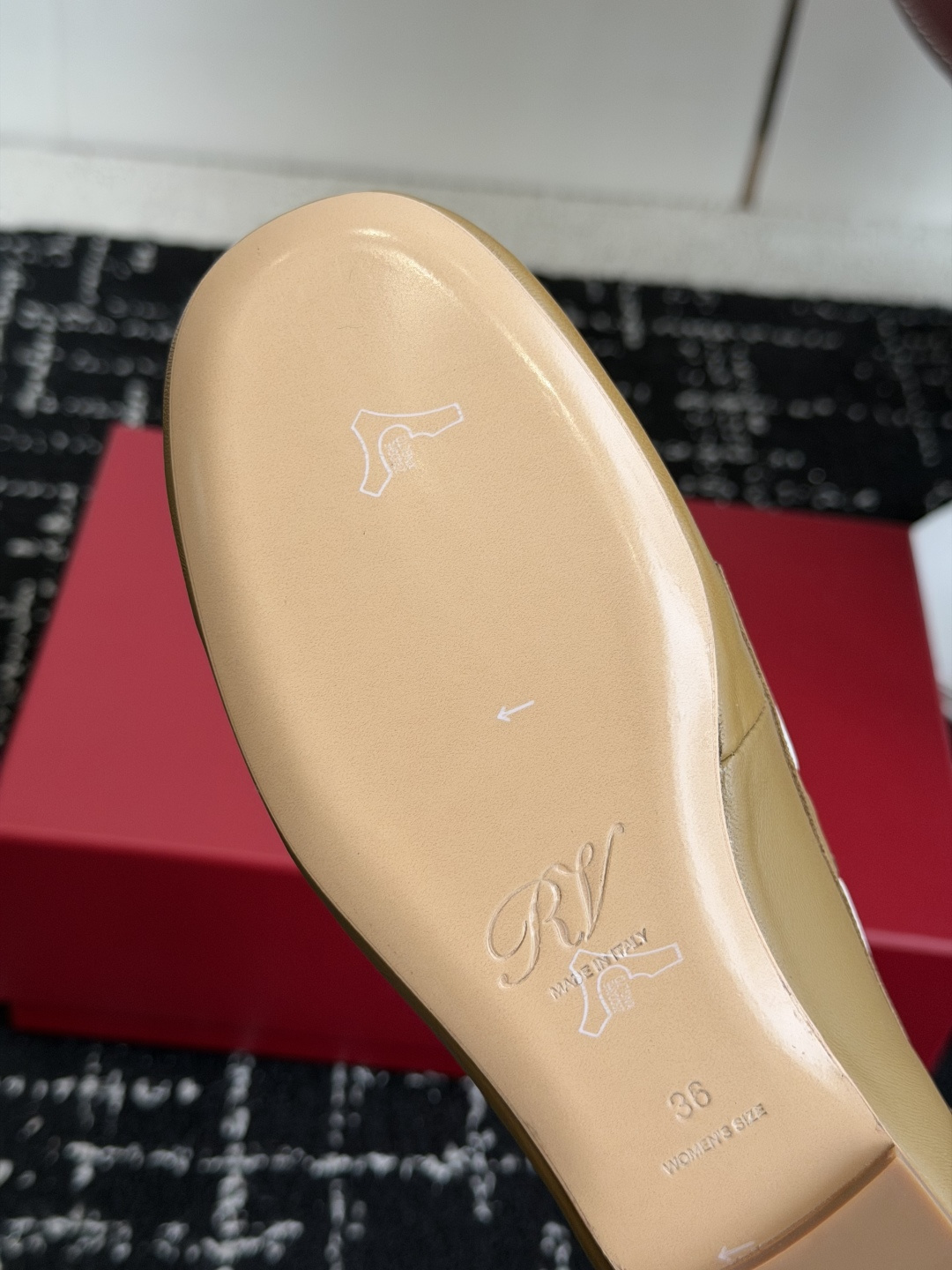 這款鞋子是AAAAA 1:1 質量(非常棒). 使用了和原版一模一樣的材料. 商標部分也保持了和羅傑維維耶/Roger Vivier一樣. 圖片拍攝是實物鞋子拍攝, 您所收到的實物保證和我們圖片一模一樣.