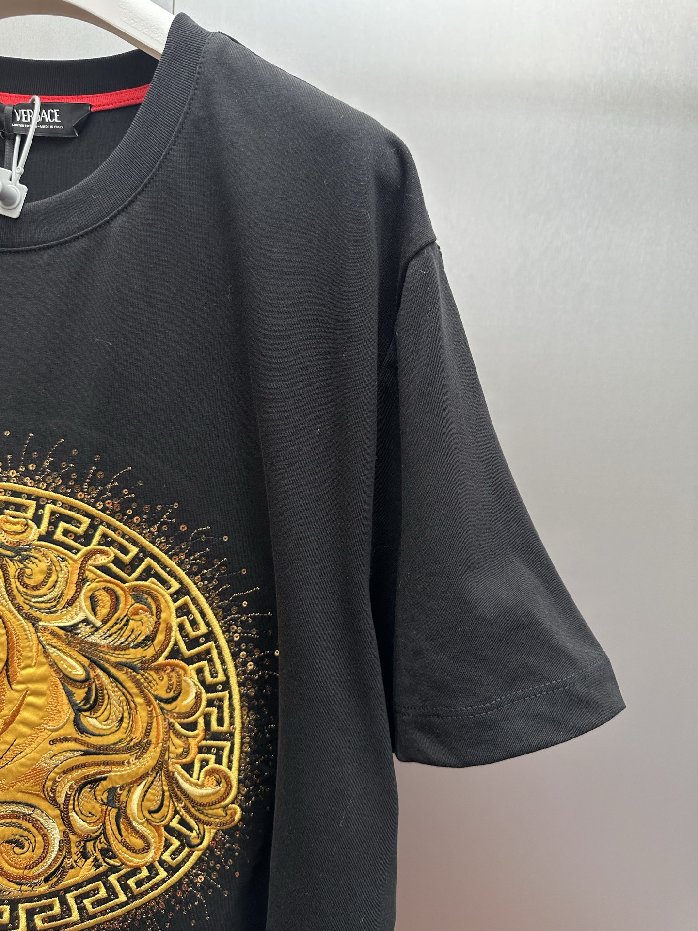 這款衣服是AAAAA 1:1 質量(非常棒). 使用了和原版一模一樣的材料. 商標部分也保持了和范思哲/Versace一樣. 圖片拍攝是實物衣服拍攝, 您所收到的實物保證和我們圖片一模一樣.